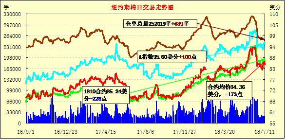 7月11日紐約期棉市場全面大幅收跌。1812合約結算價84.54美分,跌184點;1903合約結算價84.35美分,跌167點;1905合約結算價84.23美分,跌162點。其他合約下跌141-150點不等。當日12月合約小幅低開,因缺乏有利支撐開盤后維持下行態(tài)勢,至當日低點84.34美分處買盤入場,交易重心受支撐小幅走高,因上漲動力不足,以跌勢收盤。北京時間周三特朗普政府發(fā)布了一份針對中國2000億美元商品加增關稅的計劃,由此引發(fā)的避險情緒急升。美元指數(shù)大漲,美股集體下跌,大宗商品遭血洗。