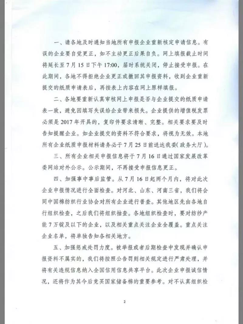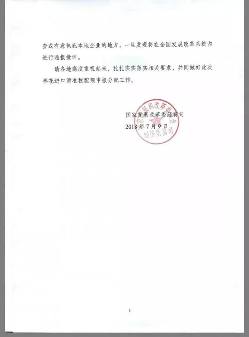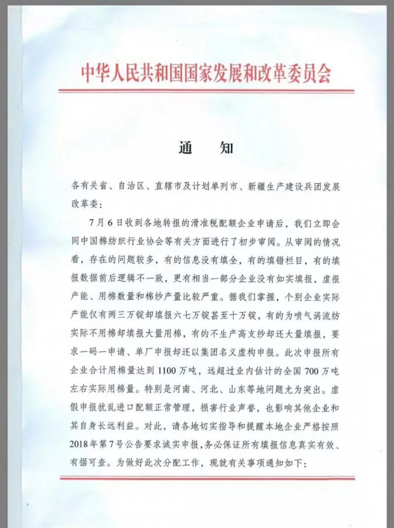 7月9日,國家發(fā)展改革委經(jīng)貿(mào)司發(fā)布《關(guān)于做好棉花進(jìn)口滑準(zhǔn)稅配額分配有關(guān)工作的通知》,由于各地轉(zhuǎn)報(bào)的滑準(zhǔn)稅配額企業(yè)申請(qǐng)存在的問題較多,國家發(fā)改委再次重申,請(qǐng)各紡織企業(yè)嚴(yán)格按照2018年第7號(hào)公告要求誠實(shí)申報(bào),務(wù)必保證所有填報(bào)信息真實(shí)有效、有據(jù)可查。以下為《通知》全文:
