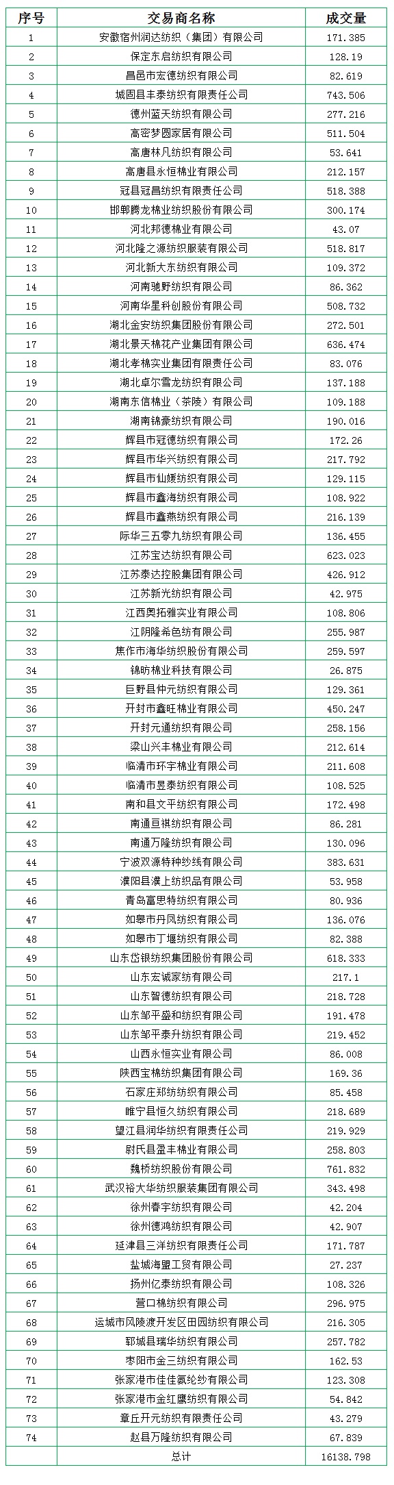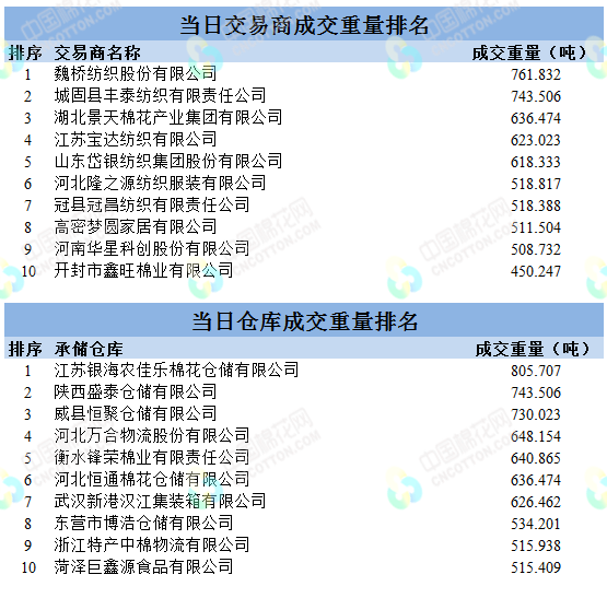 地產(chǎn)棉成交6428.009噸,成交率31.66%,成交均價(jià)14306元/噸,平均加價(jià)362元/噸,最高成交價(jià)15580元/噸,最低成交價(jià)13490元/噸;新疆棉成交9710.789噸,成交率100%,成交均價(jià)15175元/噸,平均加價(jià)955元/噸,最高成交價(jià)16510元/噸,最低成交價(jià)14310元/噸。