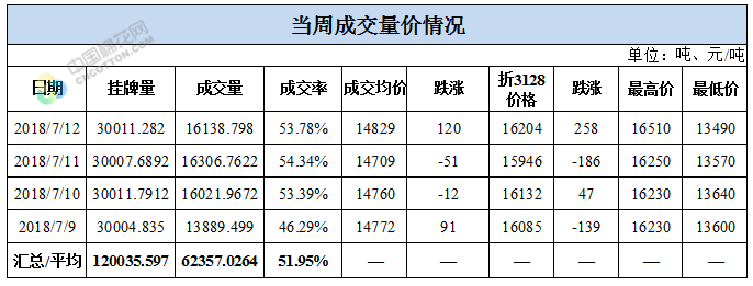 累計(jì)情況:截至7月12日,累計(jì)計(jì)劃出庫(kù)258萬(wàn)噸,累計(jì)出庫(kù)成交154.1萬(wàn)噸,成交率為60%;成交最高價(jià)17700元/噸,最低價(jià)12700元/噸。
