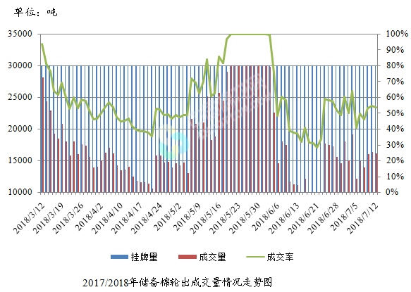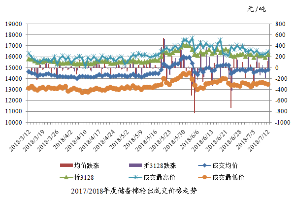 7月12日儲(chǔ)備棉輪出銷售資源30011.282噸,實(shí)際成交16138.798噸,成交率53.78%。平均成交價(jià)格14829元/噸(較前一日上漲120元/噸);折3128價(jià)格16204元/噸(較前一日上漲258元/噸)。