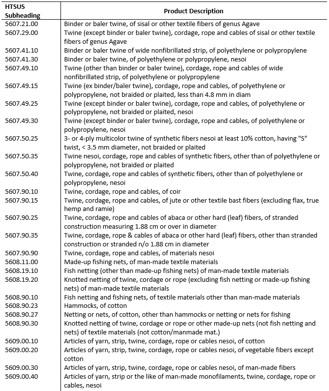 涉及加稅的《HS56章絮胎、氈呢及無紡織物、特種紗線、線、繩、索、纜及其制品》,2017年美國進口金額6.53億美元,進口同比7.35%,占美國進口比重29.37%,占中國出口比重12.84%。