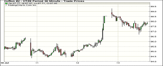 7月13日紐約期棉市場全面收跌。1812合約結(jié)算價(jià)87.84美分,跌70點(diǎn);1903合約結(jié)算價(jià)87.62美分,跌73點(diǎn);1905合約結(jié)算價(jià)87.77美分,跌46點(diǎn)。其他合約下跌5-41點(diǎn)不等。當(dāng)日12月合約高位開盤,開盤后因缺乏有力支撐市場下行,后在87.50-88.00美分區(qū)間震蕩運(yùn)行。交易中期市場出現(xiàn)進(jìn)一步下跌,至當(dāng)日低點(diǎn)86.70美分處買盤發(fā)力,交易重心受支撐走高,但因上漲動(dòng)力不足,最終以跌勢收盤。外圍美元指數(shù)下跌,玉米和大豆期貨下跌,小麥期貨上漲。美股微幅收漲。