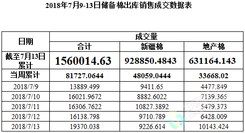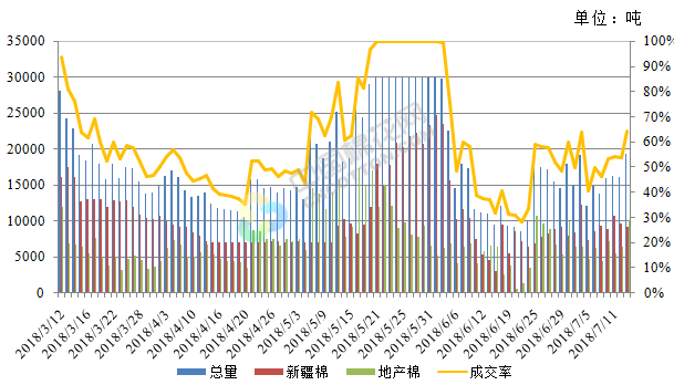 截至2018年7月13日,2017/2018年度儲(chǔ)備棉輪出累計(jì)掛牌261萬噸,其中新疆棉96萬噸、地產(chǎn)棉165萬噸;累計(jì)成交156萬噸,成交率59.8%,其中新疆棉成交92.7萬噸,成交率96.6%,地產(chǎn)棉成交63.3萬噸,成交率38.4%;累計(jì)成交企業(yè)739家,其中紡織企業(yè)589家,成交95萬噸;貿(mào)易商168家,成交61萬噸。