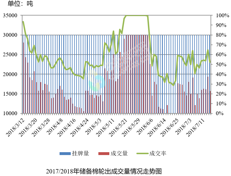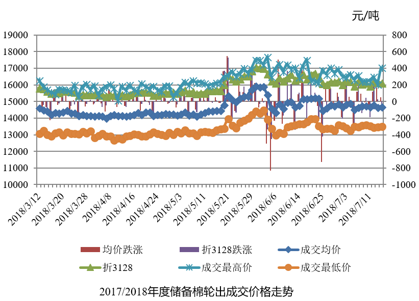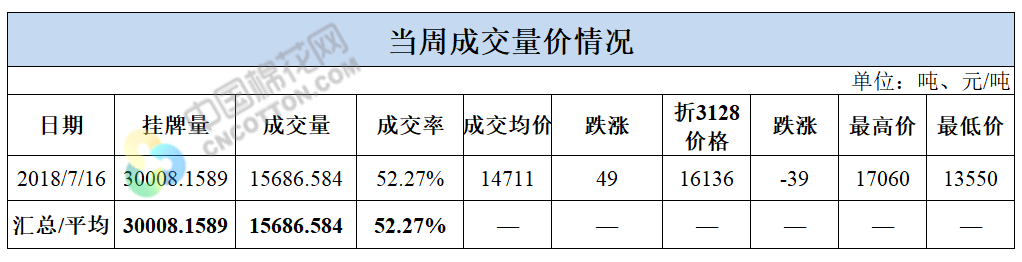 7月16日儲備棉輪出銷售資源30008.1589噸,實際成交15686.584噸,成交率52.27%。平均成交價格14711元/噸(較前一日上漲49元/噸);折3128價格16136元/噸(較前一日下跌39元/噸)。