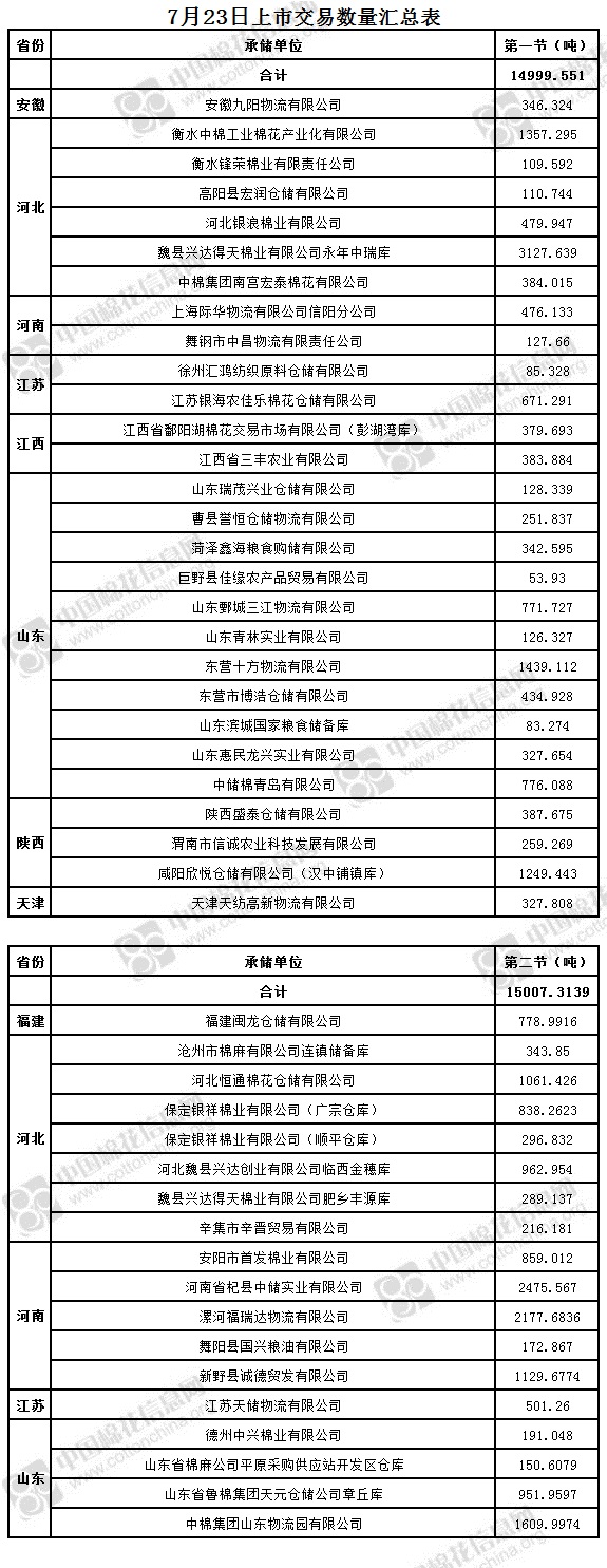 5、保定銀祥棉業(yè)有限公司(廣宗倉庫)、福建閩龍倉儲有限公司、邯鄲市興潤貿(mào)易有限公司(武安庫)、邯鄲市銀澤棉業(yè)有限公司(含有部分包檢)、河南省杞縣中儲實業(yè)有限公司、江陰市協(xié)豐棉麻有限公司(華西)、連云港新蘇豫棉花儲運有限公司、漯河福瑞達物流有限公司、山東瑞茂興業(yè)倉儲有限公司、山東省棉麻公司平原采購供應(yīng)站開發(fā)區(qū)倉庫、中棉集團山東物流園有限公司為實施按批抽樣方式檢驗的承儲庫,由于掛牌較為集中,請買方妥善協(xié)商安排出庫。