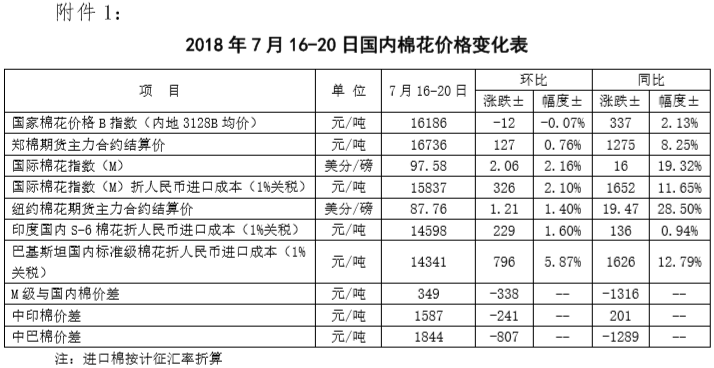 附件1:2018年7月16-20日國內(nèi)外棉花價(jià)格變化表