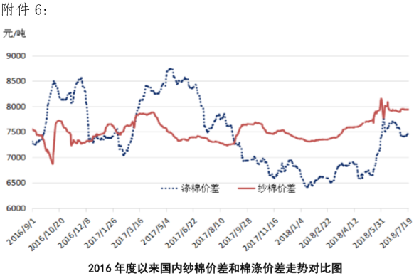 附件6:2016年度以來國內(nèi)紗棉價(jià)差和滌棉價(jià)差走勢(shì)對(duì)比圖