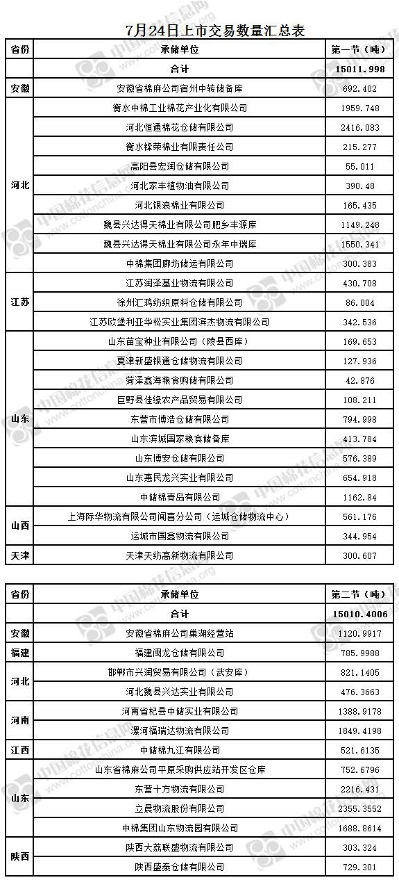 4、福建閩龍倉儲有限公司、河南省杞縣中儲實業(yè)有限公司、漯河福瑞達物流有限公司(含有部分包檢)、山東省棉麻公司平原采購供應(yīng)站開發(fā)區(qū)倉庫、立晨物流股份有限公司、河北魏縣興達實業(yè)有限公司、邯鄲市興潤貿(mào)易有限公司(武安庫)(含有部分包檢)、安徽省棉麻公司巢湖經(jīng)營站、中儲棉九江有限公司、中棉集團山東物流園有限公司為實施按批抽樣方式檢驗的承儲庫,由于掛牌較為集中,請買方妥善協(xié)商安排出庫。