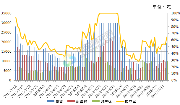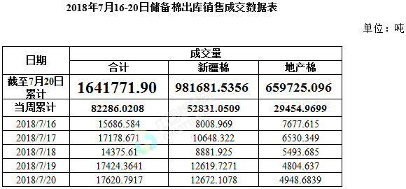 截至2018年7月20日,2017/2018年度儲備棉輪出累計掛牌276萬噸,其中新疆棉101.4萬噸、地產(chǎn)棉174.6萬噸;累計成交164.2萬噸,成交率59.5%,其中新疆棉成交98.2萬噸,成交率96.8%,地產(chǎn)棉成交66.0萬噸,成交率37.8%;累計成交企業(yè)766家,其中紡織企業(yè)598家,成交103.2萬噸;貿(mào)易商168家,成交61萬噸。