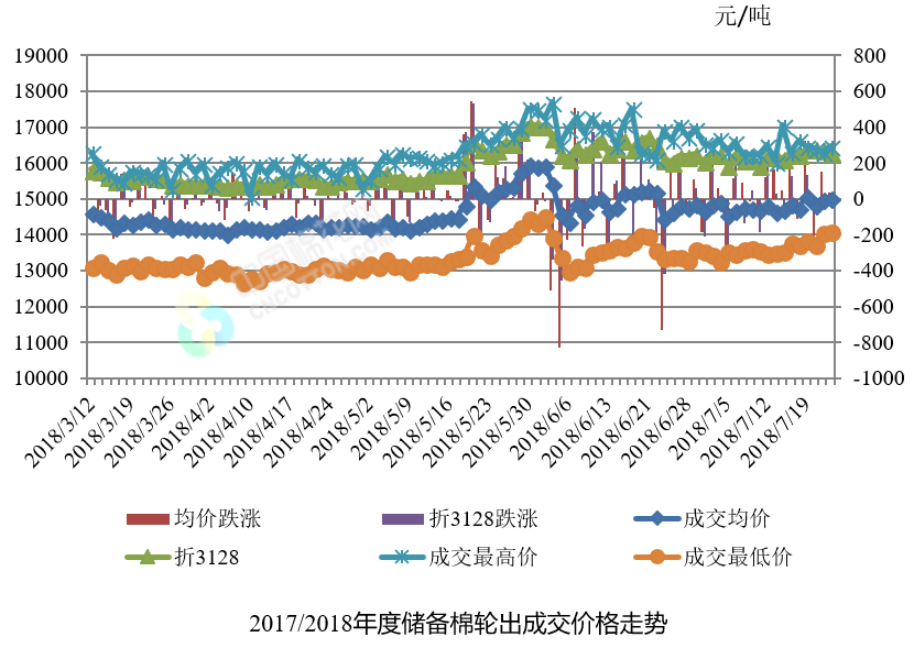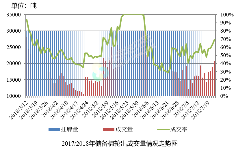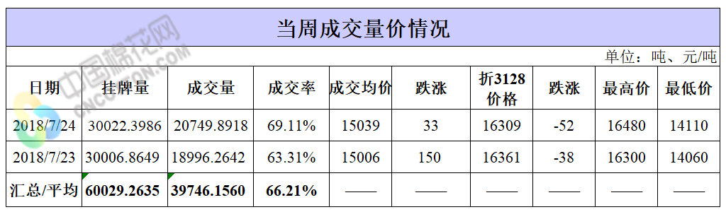 7月24日儲(chǔ)備棉輪出銷售資源30022.3986噸,實(shí)際成交20749.8918噸,成交率69.11%。平均成交價(jià)格15039元/噸(較前一日上漲33元/噸);折3128價(jià)格16309元/噸(較前一日下跌52元/噸)。