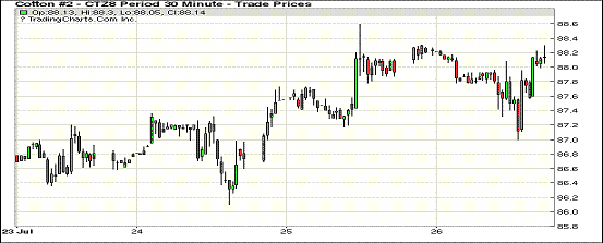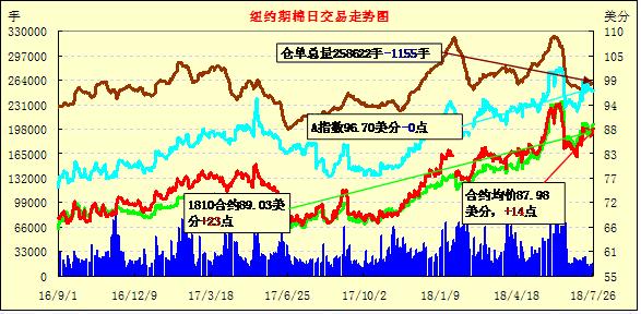 7月26日紐約期棉市場漲勢延續(xù)。1812合約結(jié)算價88.23美分,漲26點;1903合約結(jié)算價88.10美分,漲30點;1905合約結(jié)算價88.08美分,漲29點。其他合約上漲8-33點不等。當(dāng)日12月合約小幅高開,由于缺乏有力支撐,開盤后不久市場小幅下行,低點處買盤發(fā)力,交易重心受支撐走高,最終延續(xù)前一日漲勢,以小幅上漲收盤。近兩個交易日12月合約累計上漲153點。據(jù)美國農(nóng)業(yè)部(USDA),7.13-7.19一周美國凈簽約出口本年度陸地棉525噸,較前一周和近四周平均簽約量分別下降82%和93%;裝運66514噸,較前一周增加29%,較近四周平均裝運量減少7%;凈簽約本年度皮馬棉1322噸,較前一周和近四周平均簽約量明顯增加;皮馬棉裝運4203噸,較前一周和近四周平均簽約量分別增加50%和36%;凈簽約2018/19年度陸地棉45161噸,皮馬棉1053噸。未點價合約量維持高位,對棉價形成支撐。雖然周三夜間西德州地區(qū)出現(xiàn)局部陣雨天氣,但遠(yuǎn)不足以改善當(dāng)?shù)睾登椤:登檫t遲得不到有效解決,市場普遍擔(dān)憂。外圍美元指數(shù)上漲,大豆、玉米和小麥期貨下跌。