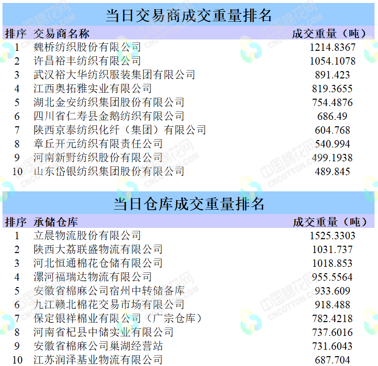 地產(chǎn)棉成交6495.2907噸,成交率37.56%,成交均價14460元/噸,平均加價306元/噸,最高成交價15810元/噸,最低成交價14090元/噸。新疆棉成交12447.7034噸,成交率97.95%,成交均價15115元/噸,平均加價655元/噸,最高成交價16120元/噸,最低成交價14400元/噸。