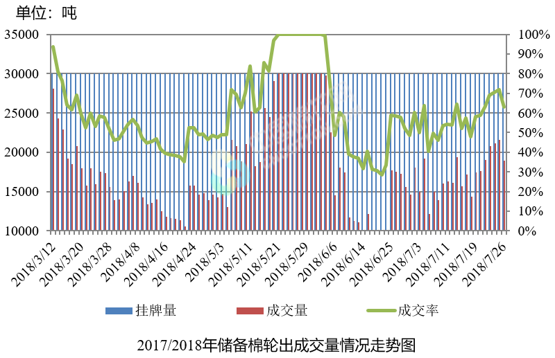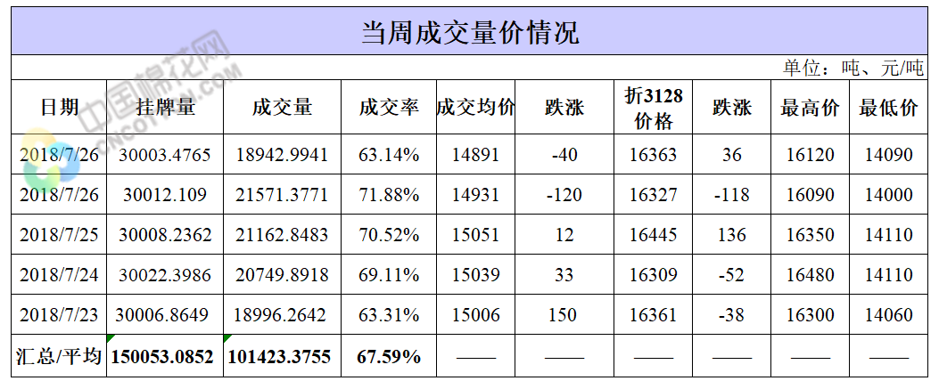 7月27日儲備棉輪出銷售資源30003.4765噸,實際成交18942.9941噸,成交率63.14%。平均成交價格14891元/噸(較前一日下跌40元/噸);折3128價格16363元/噸(較前一日上漲36元/噸)。