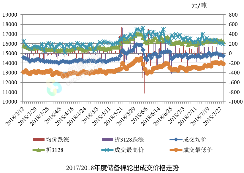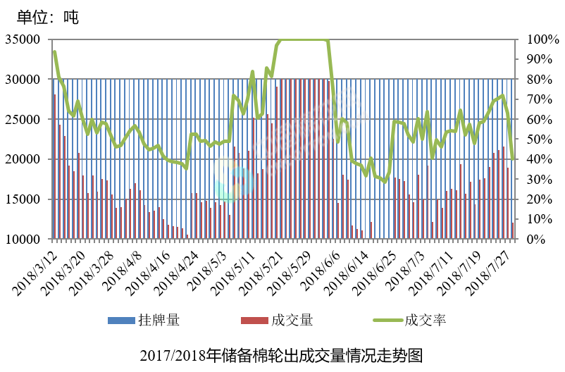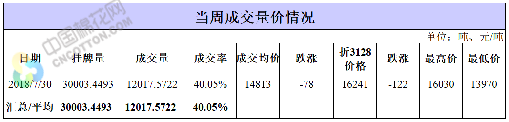 7月30日儲(chǔ)備棉輪出銷(xiāo)售資源30003.4493噸,實(shí)際成交12017.5722噸,成交率40.05%。平均成交價(jià)格14813元/噸(較前一日下跌78元/噸);折3128價(jià)格16241元/噸(較前一日下跌122元/噸)。