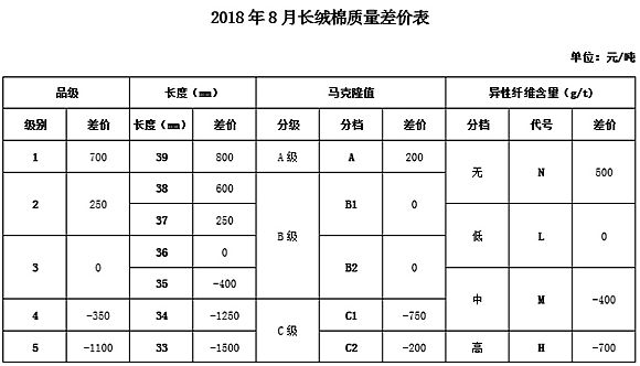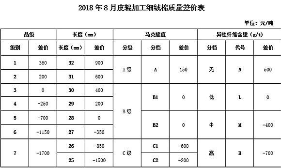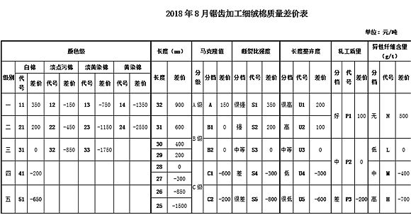 根據《中國棉花協(xié)會國產棉質量差價表管理辦法》規(guī)定,現(xiàn)正式發(fā)布2018年8月《鋸齒加工細絨棉質量差價表》、《皮輥加工細絨棉質量差價表》和《長絨棉質量差價表》(單位:元/噸)。