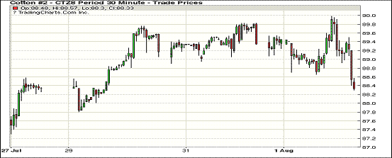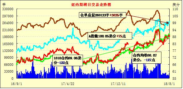 8月第一個(gè)交易日紐約期棉市場(chǎng)結(jié)束5連漲,全面收跌。1812合約結(jié)算價(jià)88.34美分,跌125點(diǎn);1903合約結(jié)算價(jià)88.28美分,跌122點(diǎn);1905合約結(jié)算價(jià)88.37美分,跌102點(diǎn)。其他合約下跌25-95點(diǎn)不等。當(dāng)日12月合約小幅低開(kāi),開(kāi)盤(pán)后因缺乏有力支撐交易重心繼續(xù)走低,后買盤(pán)低點(diǎn)發(fā)力,市場(chǎng)受支撐上行,但不敵賣盤(pán)施壓迅速回落,后至收盤(pán)維持下行態(tài)勢(shì),最終大幅收跌。美棉出口周報(bào)發(fā)布在即,隨著本年度的結(jié)束,市場(chǎng)都在猜測(cè)未裝運(yùn)部分是否會(huì)結(jié)轉(zhuǎn)至新年度。同時(shí)也普遍擔(dān)憂中國(guó)是否會(huì)大量取消。外圍美元指數(shù)上漲,小麥期貨上漲,玉米和大豆期貨下跌。