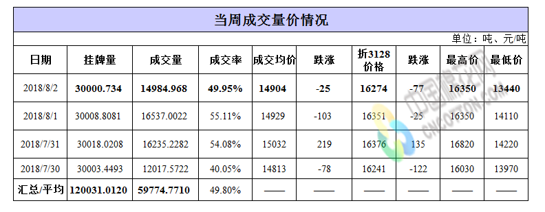 累計(jì)情況:截至8月2日,累計(jì)計(jì)劃出庫303萬噸,累計(jì)出庫成交180.2萬噸,成交率為59.46%;成交最高價(jià)17700元/噸,最低價(jià)12700元/噸。