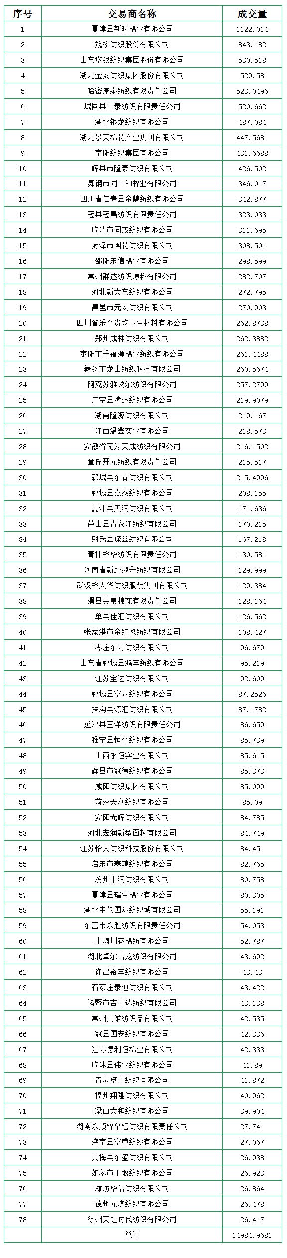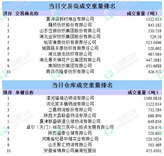 地產(chǎn)棉成交5319.505噸,成交率27.76%,成交均價(jià)14481元/噸,平均加價(jià)310元/噸,最高成交價(jià)15350元/噸,最低成交價(jià)13440元/噸。新疆棉成交9665.4631噸,成交率89.2%,成交均價(jià)15137元/噸,平均加價(jià)588元/噸,最高成交價(jià)16350元/噸,最低成交價(jià)14220元/噸。