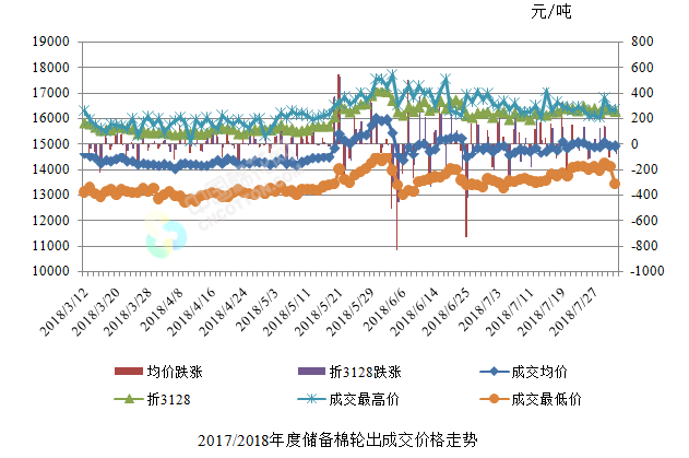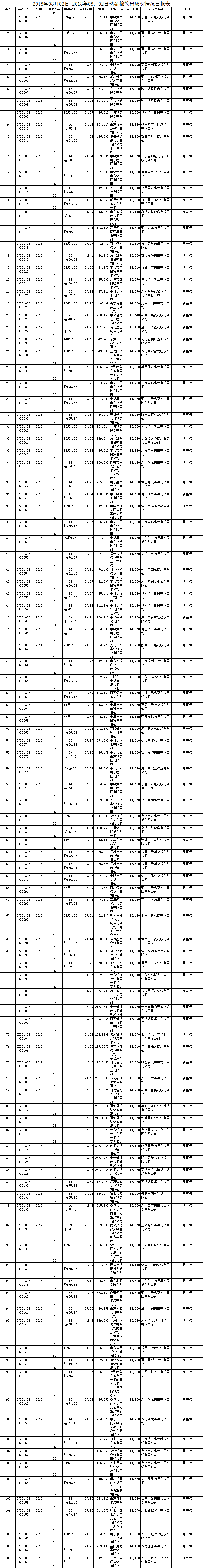 8月2日儲(chǔ)備棉輪出銷售資源30000.7338噸,實(shí)際成交14984.9681噸,成交率49.95%。平均成交價(jià)格14904元/噸(較前一日下跌25元/噸);折3128價(jià)格16274元/噸(較前一日下跌77元/噸)。