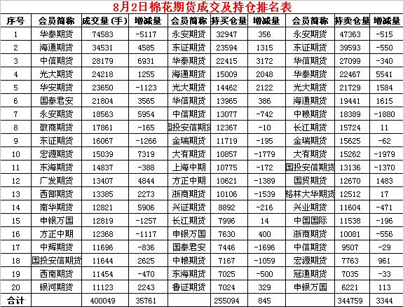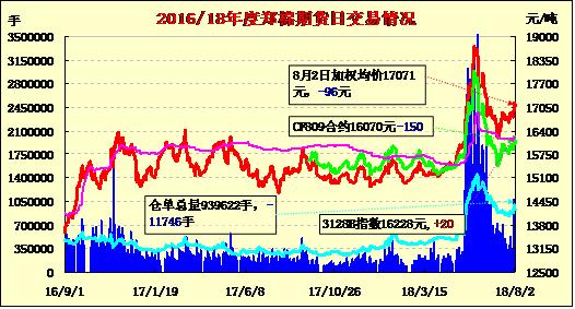 8月2日隔夜鄭棉沖高回落,今日早盤受外棉下跌影響下滑盤整,午后放量下滑創(chuàng)日低,隨后在買盤推動下回升,日線形成小陰線。日內(nèi)成交量放大,持倉量減少?;久媲闆r:周二東南部地區(qū)有強(qiáng)風(fēng)暴過境,帶來大風(fēng)和短時強(qiáng)降雨,近期預(yù)計(jì)仍將出現(xiàn)惡劣天氣。近日該地區(qū)多區(qū)域降雨量在2.5-7.6厘米,至本周周末預(yù)計(jì)還將有5.1-7.6厘米的降雨。大量降雨將使土壤含水量進(jìn)一步增加,目前多區(qū)域已發(fā)布洪水預(yù)警。