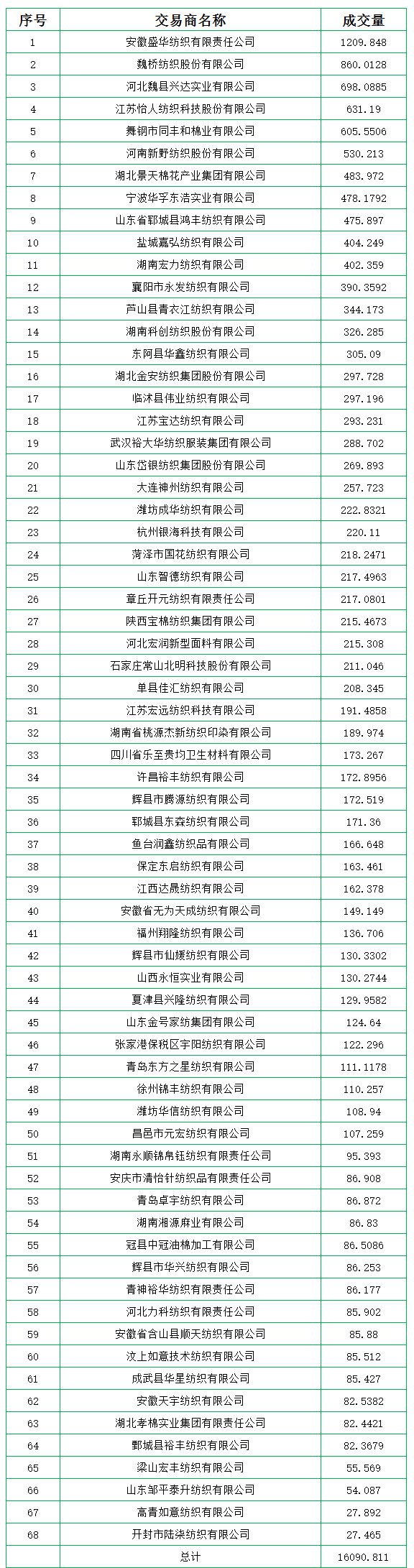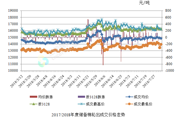 8月3日儲(chǔ)備棉輪出銷售資源30002.1491噸,實(shí)際成交16090.811噸,成交率53.63%。平均成交價(jià)格14856元/噸(較前一日下跌73元/噸);折3128價(jià)格16296元/噸(較前一日下跌55元/噸)。