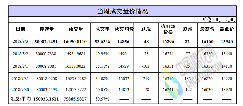 累計(jì)情況:截至8月3日,累計(jì)計(jì)劃出庫(kù)306萬(wàn)噸,累計(jì)出庫(kù)成交181.81萬(wàn)噸,成交率為59.4%;成交最高價(jià)17700元/噸,最低價(jià)12700元/噸。