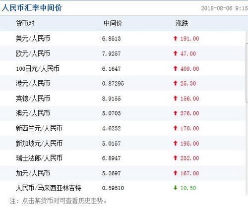 中國人民銀行授權中國外匯交易中心公布,2018年8月6日銀行間外匯市場人民幣匯率中間價為:1美元對人民幣6.8513元,1歐元對人民幣7.9257元,100日元對人民幣6.1647元,1港元對人民幣0.87295元,1英鎊對人民幣8.9155元,1澳大利亞元對人民幣5.0703元,1新西蘭元對人民幣4.6232元,1新加坡元對人民幣5.0157元,1瑞士法郎對人民幣6.8947元,1加拿大元對人民幣5.2697元,人民幣1元對0.59510馬來西亞林吉特,人民幣1元對9.2491俄羅斯盧布,人民幣1元對1.9460南非蘭特,人民幣1元對164.31韓元,人民幣1元對0.53562阿聯(lián)酋迪拉姆,人民幣1元對0.54689沙特里亞爾,人民幣1元對40.3570匈牙利福林,人民幣1元對0.53706波蘭茲羅提,人民幣1元對0.9400丹麥克朗,人民幣1元對1.3013瑞典克朗,人民幣1元對1.2043挪威克朗,人民幣1元對0.74399土耳其里拉,人民幣1元對2.7077墨西哥比索,人民幣1元對4.8532泰銖。