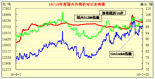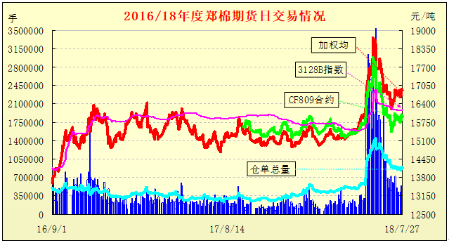 4、資金炒作,棉價暴漲,多舉施壓,棉價回穩(wěn)。受國內(nèi)棉花直補(bǔ)政策和儲備棉政策影響,2017年來,我國棉花持續(xù)保持平穩(wěn)運(yùn)行態(tài)勢,價格水平基本穩(wěn)定15500-16000元/噸區(qū)間運(yùn)行。然而2018年5月下旬至6月初,由于過渡炒作新疆氣候,大量資金涌入鄭棉期貨,導(dǎo)致連續(xù)出現(xiàn)漲停板,價格豎直飚漲,幾個交易日價格由15200元/噸迅速拉高到18500元/噸以上,暴漲3300元/噸左右,漲幅達(dá)21.7%。與此同時,持續(xù)交易冷清的棉紗期貨也顯得十分火暴,成交大增,價格迅速飚漲,由23200元/噸迅速漲至27400元/噸以上,上漲4200元/噸,漲幅達(dá)18%以上。受此影響,現(xiàn)貨、儲備棉價格也相繼跟進(jìn),不過跟進(jìn)相對謹(jǐn)慎,速度緩慢,交易也十分清淡。之后在國家采取增發(fā)棉花進(jìn)口配額、儲備棉設(shè)紡織專場、期棉強(qiáng)化管理等措施,棉花開始回穩(wěn)。國際方面,受全球棉花產(chǎn)需缺口和庫存減少等因素影響,國際棉價以大漲小跌的特點(diǎn)持續(xù)強(qiáng)勢上揚(yáng),并在其強(qiáng)勢上漲、國內(nèi)匯率升值、棉花增值稅下調(diào)等多因素疊加作用下,進(jìn)口棉折口岸價大幅縮水,內(nèi)外價差大幅縮小。主要棉花市場近年走勢圖示如下: