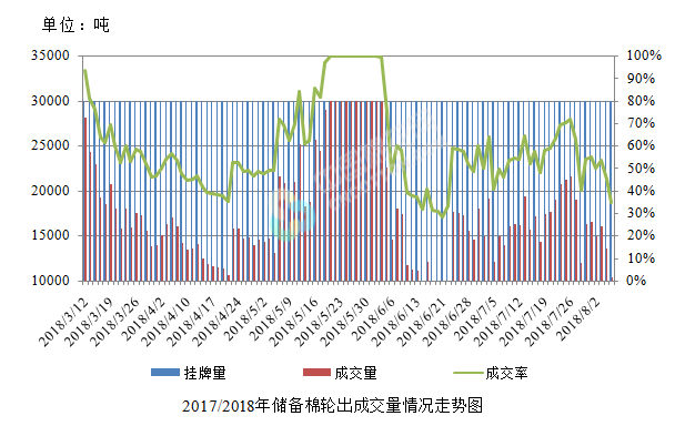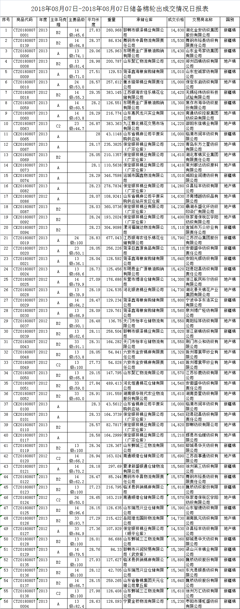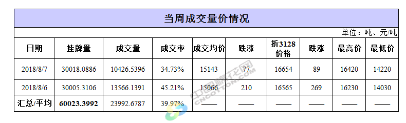 8月7日儲(chǔ)備棉輪出銷售資源30018.0886噸,實(shí)際成交10426.5396噸,成交率34.73%。平均成交價(jià)格15143元/噸(較前一日上漲77元/噸);折3128價(jià)格16654元/噸(較前一日上漲89元/噸)。