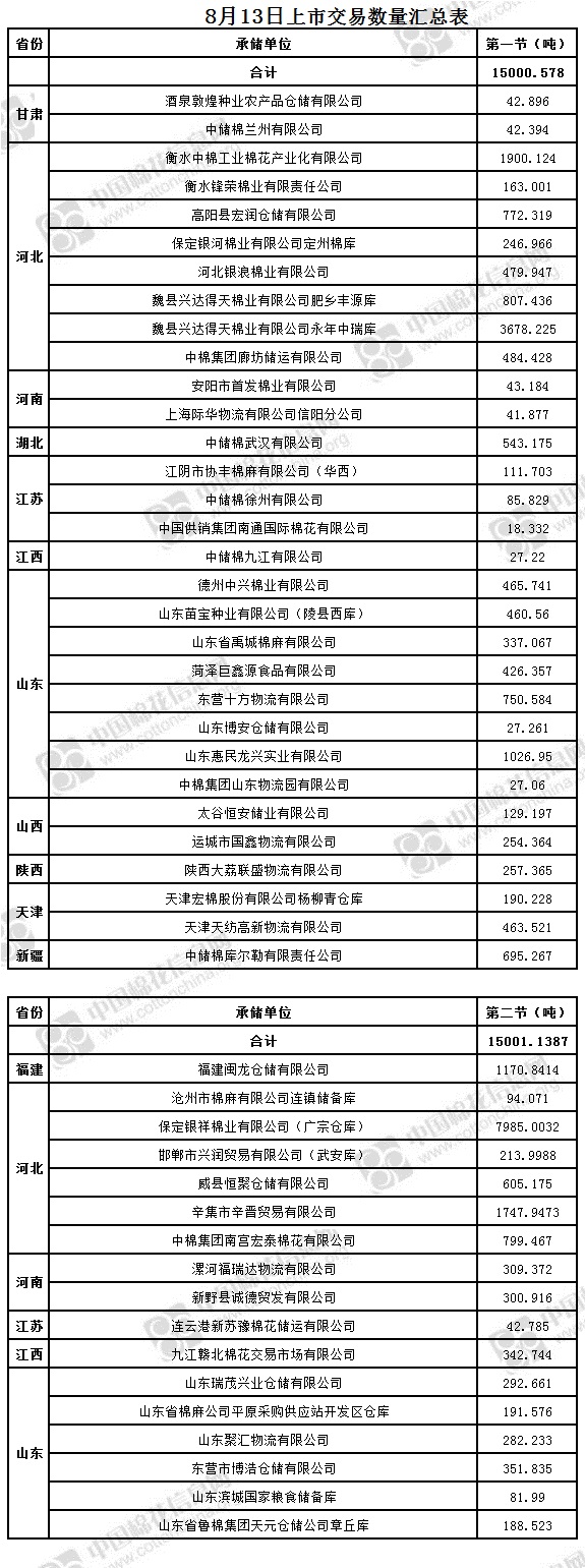 8月13日兩節(jié)共計(jì)輪出儲(chǔ)備棉30001.7167噸。第一節(jié)銷售儲(chǔ)備棉15000.578噸,其中需要倒垛出庫(kù)79捆。第二節(jié)銷售儲(chǔ)備棉15001.1387噸,其中需要倒垛出庫(kù)76捆。