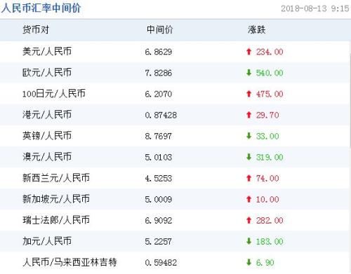 中國人民銀行授權中國外匯交易中心公布,2018年8月13日銀行間外匯市場人民幣匯率中間價為:1美元對人民幣6.8629元,1歐元對人民幣7.8286元,100日元對人民幣6.2070元,1港元對人民幣0.87428元,1英鎊對人民幣8.7697元,1澳大利亞元對人民幣5.0103元,1新西蘭元對人民幣4.5253元,1新加坡元對人民幣5.0009元,1瑞士法郎對人民幣6.9092元,1加拿大元對人民幣5.2257元,人民幣1元對0.59482馬來西亞林吉特,人民幣1元對9.9566俄羅斯盧布,人民幣1元對2.0705南非蘭特,人民幣1元對164.49韓元,人民幣1元對0.53478阿聯(lián)酋迪拉姆,人民幣1元對0.54604沙特里亞爾,人民幣1元對41.2877匈牙利福林,人民幣1元對0.54903波蘭茲羅提,人民幣1元對0.9518丹麥克朗,人民幣1元對1.3308瑞典克朗,人民幣1元對1.2181挪威克朗,人民幣1元對0.97369土耳其里拉,人民幣1元對2.7698墨西哥比索,人民幣1元對4.8502泰銖。
