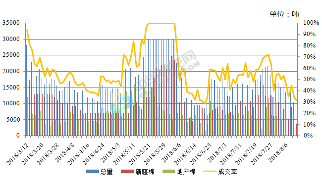 上周(2018年8月6-10日),2017/2018年度儲(chǔ)備棉輪出第二十二周,中國(guó)儲(chǔ)備棉管理有限公司上市交易儲(chǔ)備棉15萬(wàn)噸,其中新疆棉3.3萬(wàn)噸,地產(chǎn)棉11.7萬(wàn)噸;實(shí)際成交5.7萬(wàn)噸,成交率38.1%,新疆棉成交3.1萬(wàn)噸,成交率93.9%,地產(chǎn)棉成交2.6萬(wàn)噸,成交率22.2%。