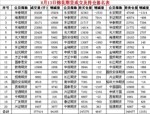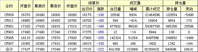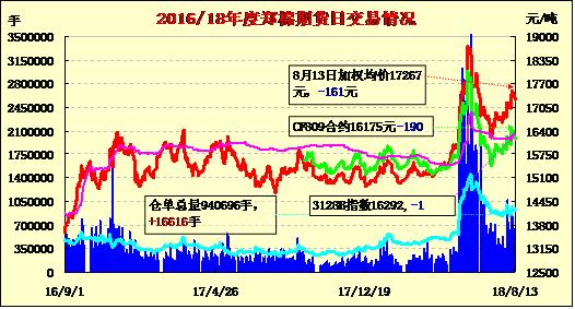 8月13日隔夜鄭棉盤整,今日早盤受外棉下跌影響跳水,隨后在逢低買盤的支撐下脫離低點震蕩,日線形成陰線。日內成交量放大,持倉量增加?;久媲闆r:據(jù)美國農(nóng)業(yè)部(USDA)最新發(fā)布的8月份全球棉花供需預測報告,2018/19年度全球棉花總產(chǎn)2624.2萬噸,相比上月調增9.1萬噸,相比2017/18年度減少64.9萬噸,減幅2.4%。全球消費量2778.6萬噸,調增14.5萬噸,較2017/18年度增加106.1萬噸,增幅4%;進出口貿易量約910萬噸,調增12.2萬噸。全球期末庫存1678.7萬噸,調減16.1萬噸,相比2017/18年度減少161.3萬噸,減幅8.8%,全球庫存消費比61.31%,同比減少7.5個百分點。