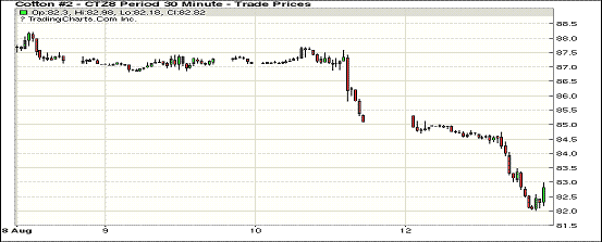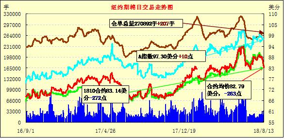 13日紐約期棉市場(chǎng)全面受挫,跌勢(shì)持續(xù)。1812合約結(jié)算價(jià)82.76美分,跌247點(diǎn);1903合約結(jié)算價(jià)83.20美分,跌251點(diǎn);1905合約結(jié)算價(jià)83.70美分,跌247點(diǎn)。其他合約下跌142-234點(diǎn)不等。當(dāng)日12月合約小幅高開,整日交易呈下行態(tài)勢(shì),開盤后因缺乏有力支撐,交易重心小幅走低,后跌幅加深,至當(dāng)日低點(diǎn)82.01美分處買盤入場(chǎng),交易重心受支撐小幅走高,但因上漲動(dòng)力不足,最終以大幅下跌收盤。近兩個(gè)交易日12月合約累計(jì)下跌450點(diǎn),為7月5日以來最低。在美國農(nóng)業(yè)部(USDA)上周五發(fā)布的供需平衡表中,將美國期初庫存和總產(chǎn)都進(jìn)行了調(diào)增,與市場(chǎng)預(yù)期相悖,打了一個(gè)措手不及。同時(shí),美國對(duì)土耳其制裁繼續(xù)發(fā)酵,引發(fā)市場(chǎng)普遍擔(dān)憂;加之上周末期間西德州迎來降雨天氣。多因素疊加之下,期棉市場(chǎng)全面下挫。外圍美元指數(shù)上漲,大豆期貨上漲,玉米和小麥期貨下跌。美股收跌,道指連續(xù)四個(gè)交易日下滑。