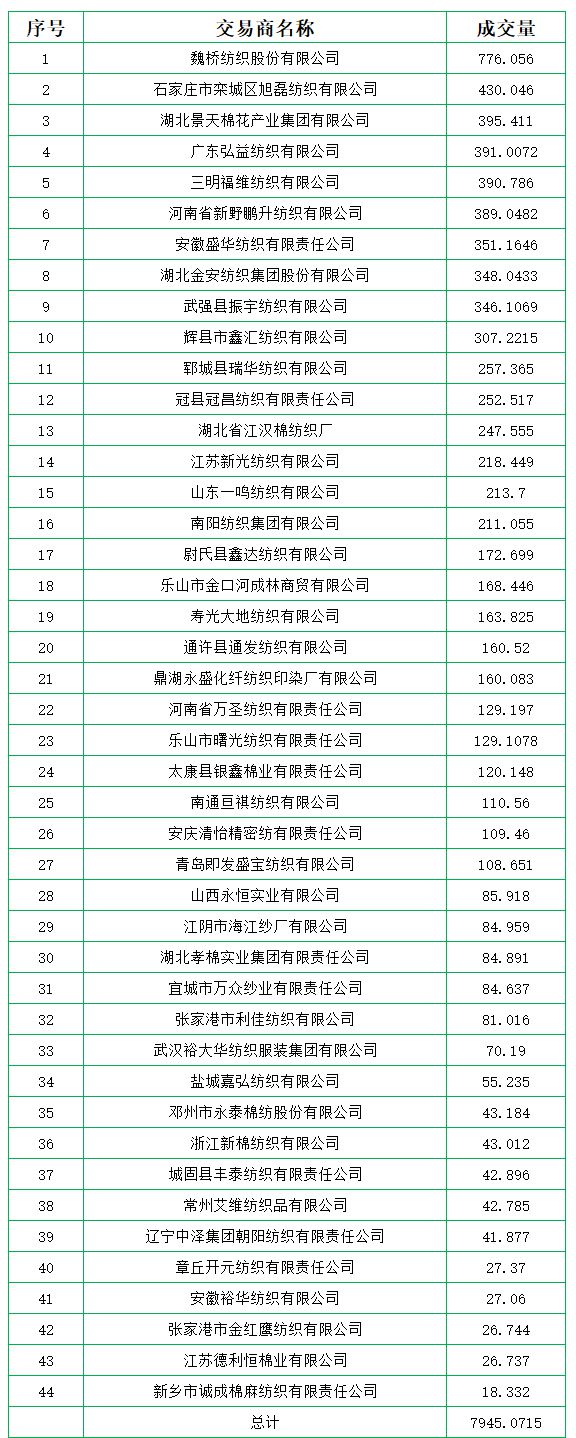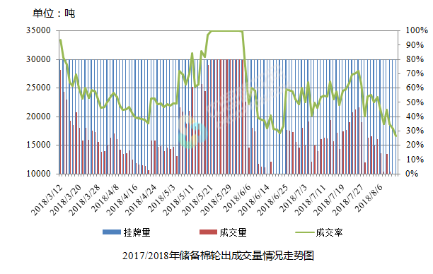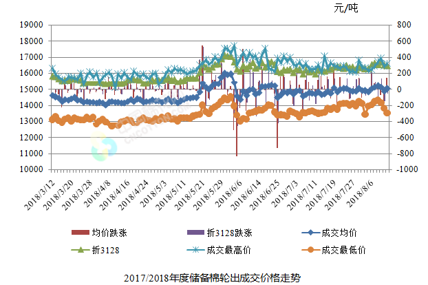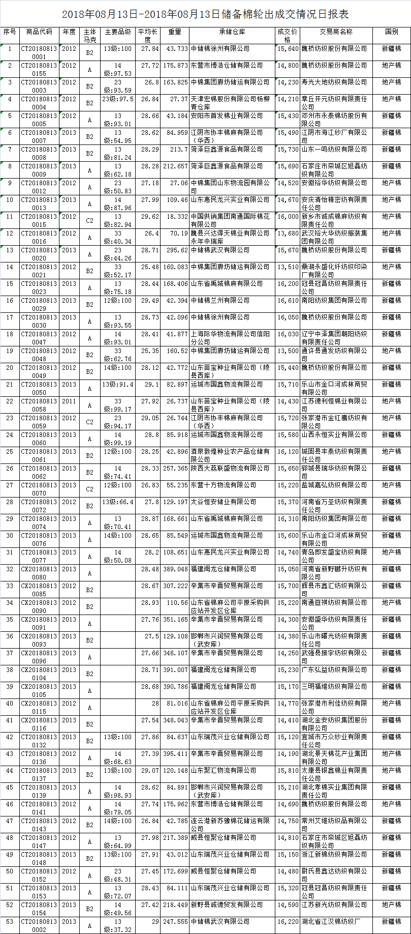 8月13日儲(chǔ)備棉輪出銷售資源30001.7167噸,實(shí)際成交7945.0715噸,成交率26.48%。平均成交價(jià)格15034元/噸(較前一日上漲146元/噸);折3128價(jià)格16470元/噸(較前一日下跌53元/噸)。