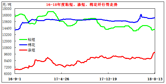 滌綸短纖與粘膠短纖作為紡織原料,其行情走勢(shì)既受下游紡織采購(gòu)需求影響,也受上游原料價(jià)格波動(dòng)、產(chǎn)能調(diào)整等多方面因素綜合作用,因而走勢(shì)具有獨(dú)立性。就如目前7-8月是紡織傳統(tǒng)淡季,雖人民幣貶值將一部分進(jìn)口紗擋在國(guó)外,但整體下游需求相對(duì)不足,不支持原料大幅上漲。不過(guò)幾種原料走勢(shì)卻呈現(xiàn)分化。