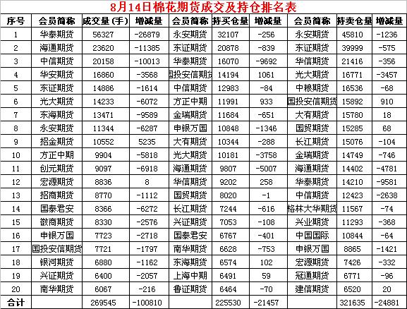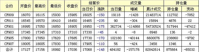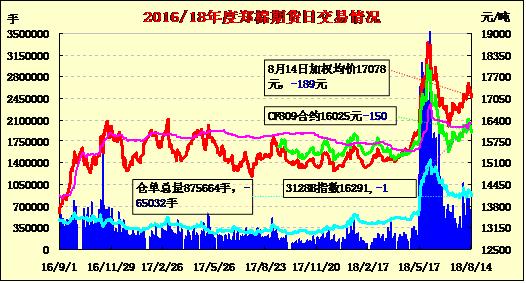 8月14日隔夜鄭棉反彈,今日早盤在平倉盤壓制下走低,隨后低位震蕩,日線形成小陰線。日內(nèi)成交量萎縮,持倉量減少。基本面情況:據(jù)美國農(nóng)業(yè)部(USDA)統(tǒng)計,截至8月12日美棉新花現(xiàn)蕾率96%,與去年同期持平和近五年平均相比均稍顯落后。新花結(jié)鈴率77%,與去年同期持平,但略落后于近五年平均。新花吐絮率13%,較去年同期及近五年平均均領(lǐng)先。