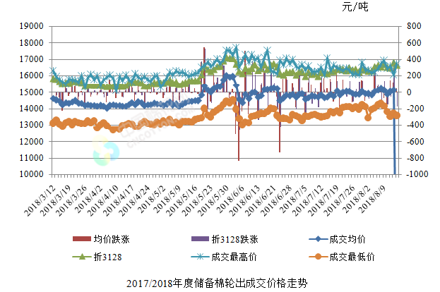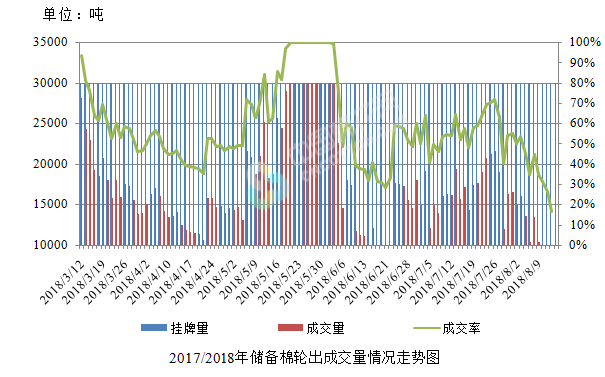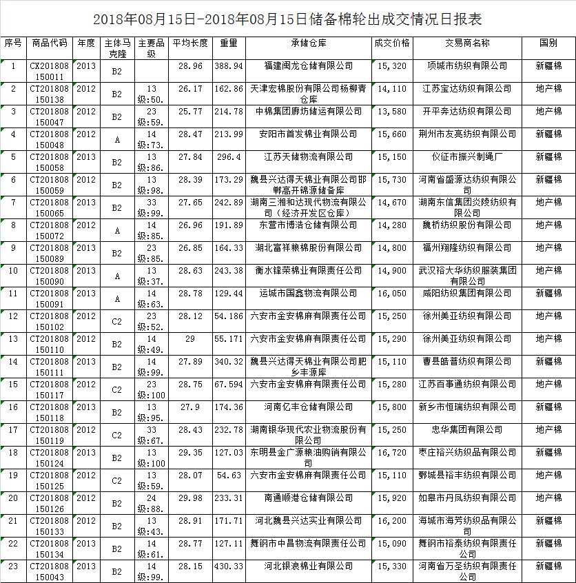 8月15日儲備棉輪出銷售資源30002.9042噸,實際成交4490.6916噸,成交率14.97%。平均成交價格15207元/噸(較前一日上漲52元/噸);折3128價格16649元/噸(較前一日下跌171元/噸)。