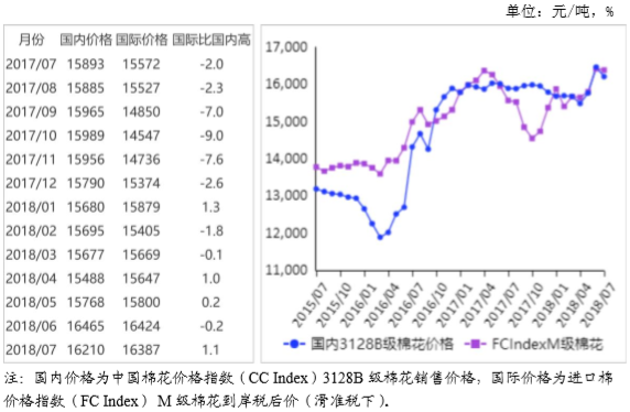 (二)國際棉花價(jià)格環(huán)比下降。7月上旬,中美貿(mào)易摩擦導(dǎo)致市場擔(dān)憂情緒升溫,ICE期棉價(jià)格有所回落。中下旬,受美國農(nóng)業(yè)部大幅下調(diào)下年度美棉產(chǎn)量和全球期末庫存,美國棉花主產(chǎn)區(qū)德州干旱等因素影響,ICE期棉價(jià)格反彈。7月CotlookA指數(shù)(相當(dāng)于國內(nèi)3128B級棉花)月均價(jià)每磅96.18美分,環(huán)比跌1.6%,同比漲14.4%。