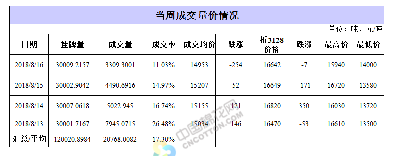 累計情況:截至8月16日,累計計劃出庫333.1萬噸,累計出庫成交189.6萬噸,成交率為56.92%;成交最高價17700元/噸,最低價12700元/噸。