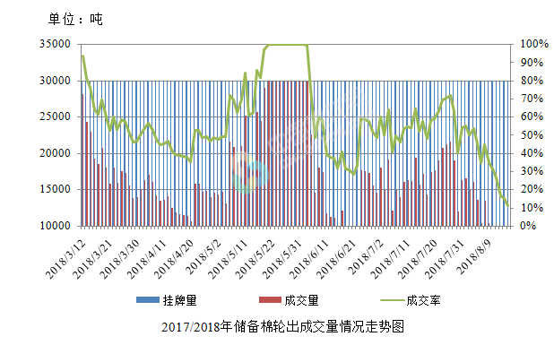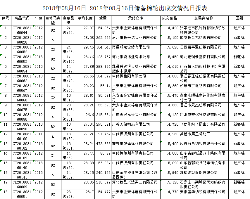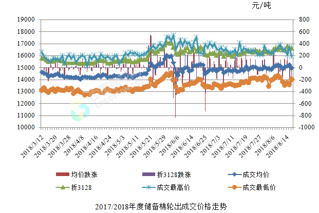 8月16日儲備棉輪出銷售資源30009.2157噸,實際成交3309.3001噸,成交率11.03%。平均成交價格14953元/噸(較前一日下跌254元/噸);折3128價格16642元/噸(較前一日下跌7元/噸)。