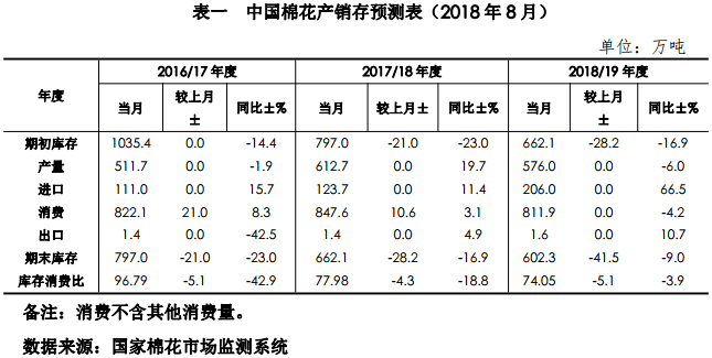 3、2018年度中國(guó)棉花市場(chǎng)供求形勢(shì)趨緊。根據(jù)國(guó)家棉花市場(chǎng)監(jiān)測(cè)系統(tǒng)6月份棉花長(zhǎng)勢(shì)調(diào)查最新情況,2018年度國(guó)內(nèi)棉花產(chǎn)量576萬(wàn)噸,消費(fèi)量811.9萬(wàn)噸,新年度國(guó)內(nèi)供需缺口235.9萬(wàn)噸,與本年度的234.9萬(wàn)噸基本持平。鑒于儲(chǔ)備棉庫(kù)存大幅下降,2018年度期初庫(kù)存則減少至662.1萬(wàn)噸,較2017年度的797萬(wàn)噸減少134.9萬(wàn)噸。2018年度庫(kù)存消費(fèi)比降至74.05%,較2017年度下降3.9%,處于2011年度以來(lái)最低水平。2018年度國(guó)內(nèi)棉花供求明顯趨緊,進(jìn)口量將超過(guò)200萬(wàn)噸。