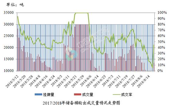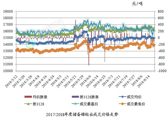 8月20日儲備棉輪出銷售資源30015.4244噸,實際成交13452.7噸,成交率44.82%。平均成交價格14959元/噸(較前一日下跌39元/噸);折3128價格16228元/噸(較前一日下跌106元/噸)。