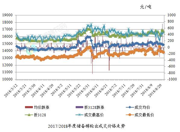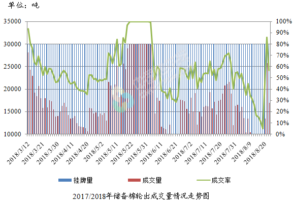8月22日儲(chǔ)備棉輪出銷售資源30001.0264噸,實(shí)際成交16951.5169噸,成交率56.50%。平均成交價(jià)格14844元/噸(較前一日下跌75元/噸);折3128價(jià)格16745元/噸(較前一日下跌216元/噸)。