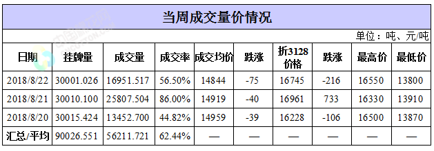 累計(jì)情況:截至8月22日,累計(jì)計(jì)劃出庫345.1萬噸,累計(jì)出庫成交195.4萬噸,成交率為57%;成交最高價(jià)17700元/噸,最低價(jià)12700元/噸。
