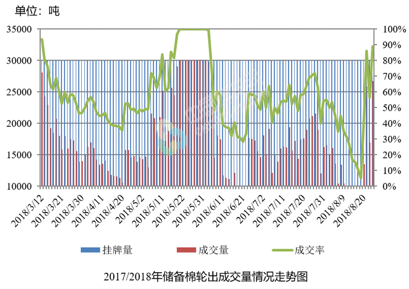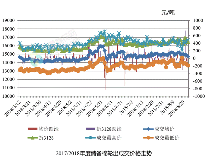 8月23日儲(chǔ)備棉輪出銷售資源30003.6455噸,實(shí)際成交26724.2055噸,成交率89.07%。平均成交價(jià)格14688元/噸(較前一日下跌156元/噸);折3128價(jià)格16434元/噸(較前一日下跌311元/噸)。