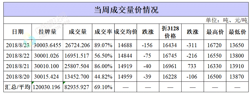累計(jì)情況:截至8月23日,累計(jì)計(jì)劃出庫348.1萬噸,累計(jì)出庫成交198.1萬噸,成交率為57%;成交最高價(jià)17700元/噸,最低價(jià)12700元/噸。