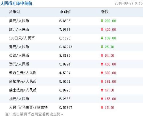 中國人民銀行授權(quán)中國外匯交易中心公布,2018年8月27日銀行間外匯市場人民幣匯率中間價為:1美元對人民幣6.8508元,1歐元對人民幣7.9777元,100日元對人民幣6.1625元,1港元對人民幣0.87273元,1英鎊對人民幣8.8182元,1澳大利亞元對人民幣5.0294元,1新西蘭元對人民幣4.5904元,1新加坡元對人民幣5.0241元,1瑞士法郎對人民幣6.9793元,1加拿大元對人民幣5.2688元,人民幣1元對0.59847馬來西亞林吉特,人民幣1元對9.8390俄羅斯盧布,人民幣1元對2.0782南非蘭特,人民幣1元對163.09韓元,人民幣1元對0.53570阿聯(lián)酋迪拉姆,人民幣1元對0.54703沙特里亞爾,人民幣1元對40.5709匈牙利福林,人民幣1元對0.53593波蘭茲羅提,人民幣1元對0.9350丹麥克朗,人民幣1元對1.3291瑞典克朗,人民幣1元對1.2143挪威克朗,人民幣1元對0.87339土耳其里拉,人民幣1元對2.7440墨西哥比索,人民幣1元對4.7702泰銖。