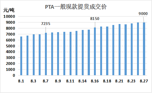 8月PTA現(xiàn)貨市場(chǎng)重要的幾個(gè)節(jié)點(diǎn),8月7日PTA成交價(jià)突破7000元/噸,16日突破8000元/噸,27日突破9000元/噸,目前PTA現(xiàn)貨價(jià)格盤整。其他產(chǎn)品情況,MEG價(jià)格向上調(diào)整態(tài)勢(shì),聚酯切片半光、有光價(jià)格向上調(diào)整,CDP切片價(jià)格盤升,水瓶片價(jià)格向上調(diào)整。
